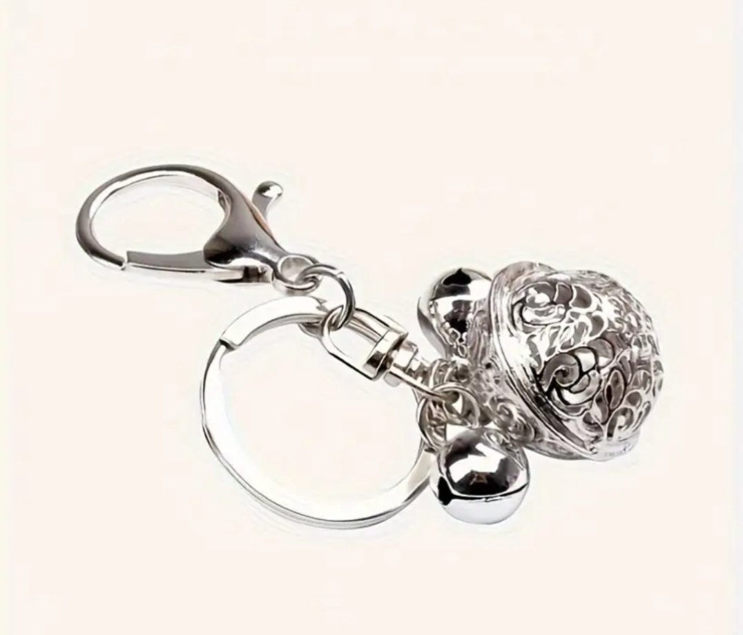 Hopeanvärinen metallipallo avaimenperä, jonka sisällä helisevä kello. Lisäksi kaksi pientä kelloa pallon yläpuolella. Kokonaispituus 10cm.