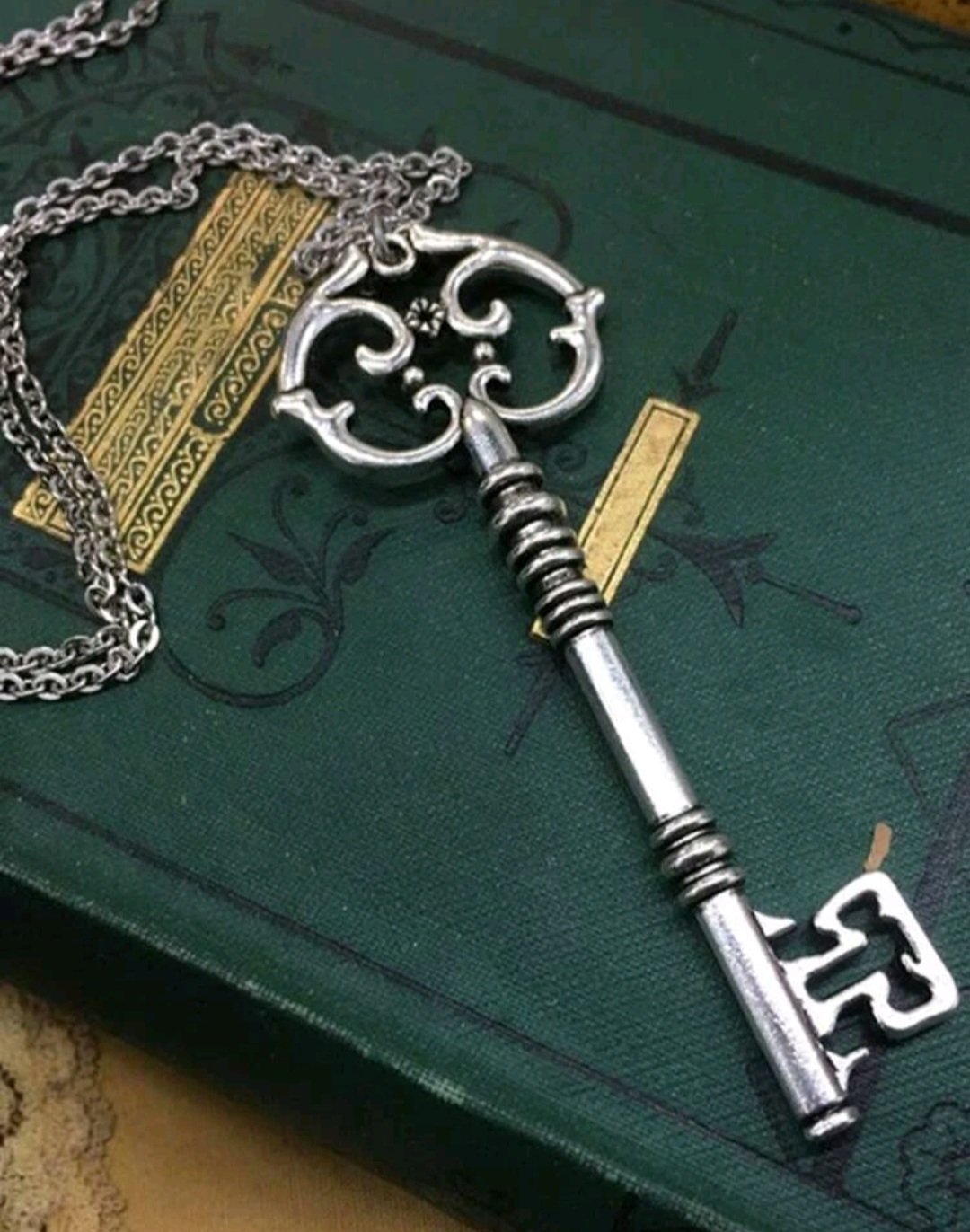 Antiikkihopean värinen metallinen avain kaulakoru.