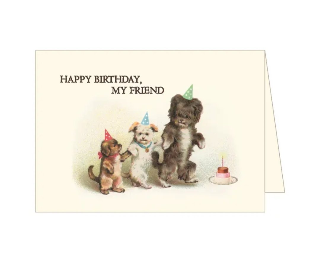Vintage-henkinen taitettu onnittelukortti, jossa on kolme koiraa syntymäpäivä hatut päässään ja toisiaan kädestä pitäen.