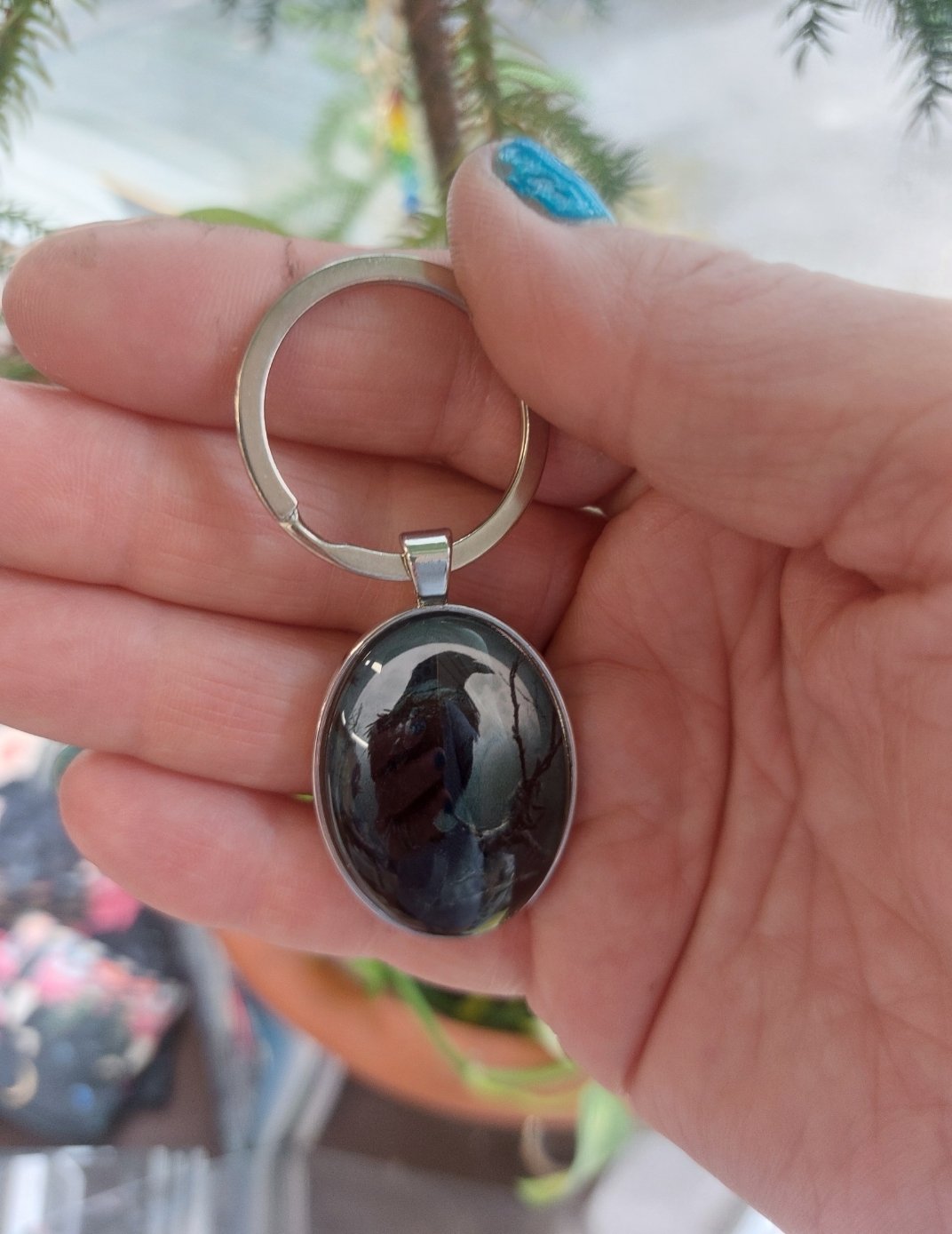 Metallinen hopeanvärinen korppi avaimenperä.
