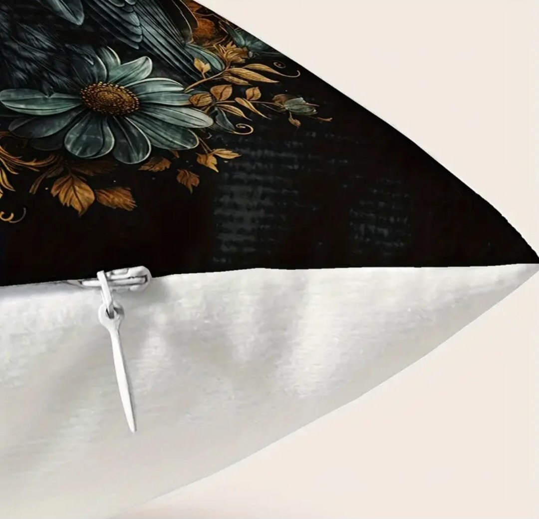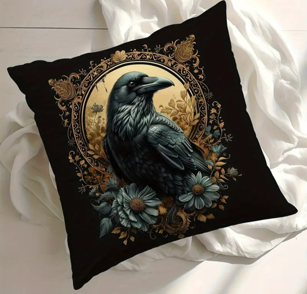 Edessä Korpin kuva, takapuoli valkoinen. Sivussa vetoketju tyynyä varten.