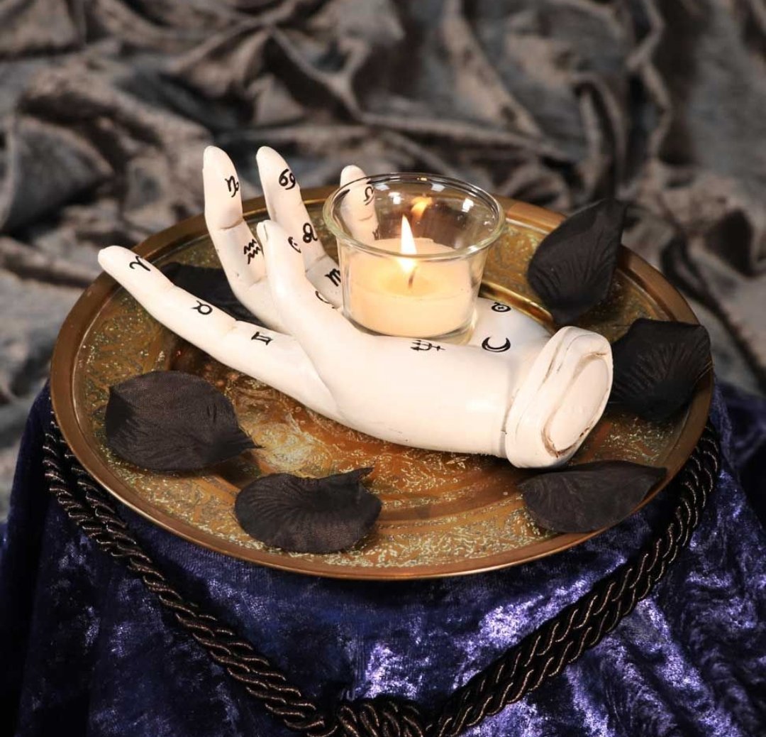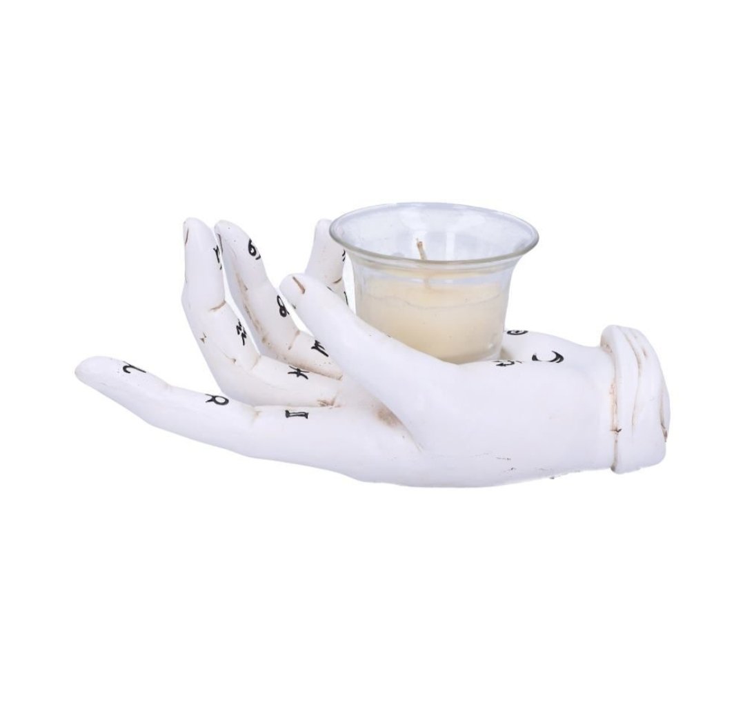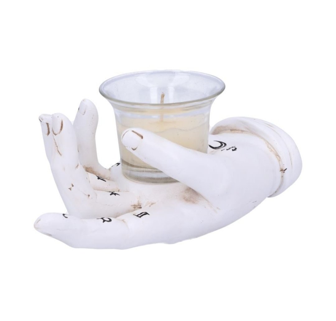Kämmenkulho/kynttiläalusta. Valkoinen posliinimainen käsi pitelee pientä lasista kynttilänjalkaa. Kämmen on maalattu käsin ja siinä on erilaisia kädestä ennustamisen merkkejä.