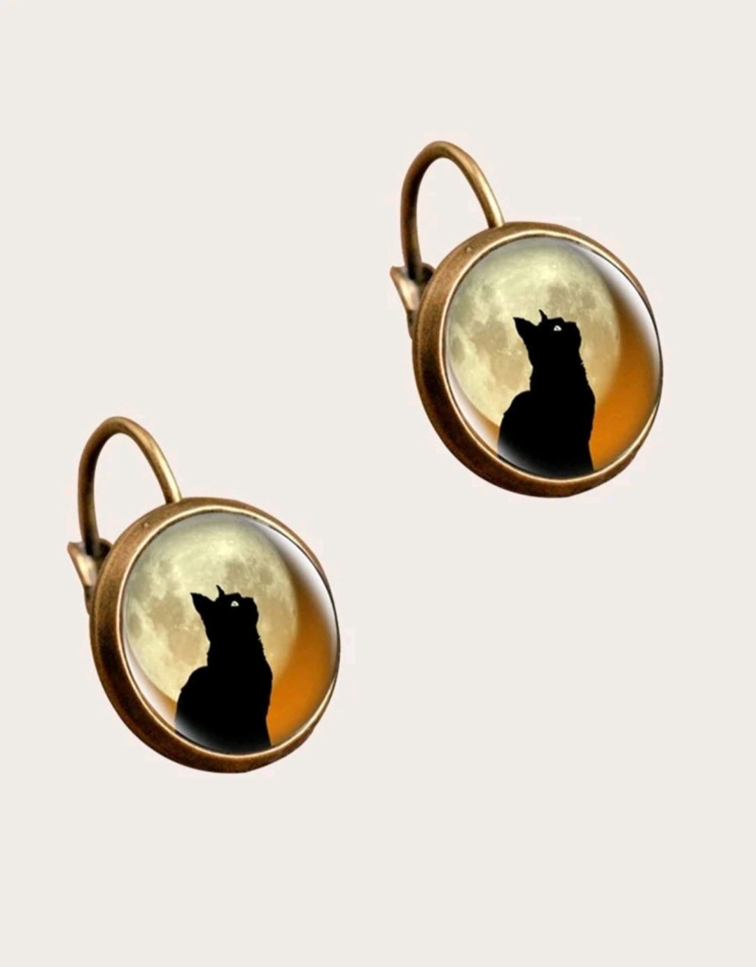 Kupariset pyöreät kissakorvikset, jossa musta kissa katselee kuuta.