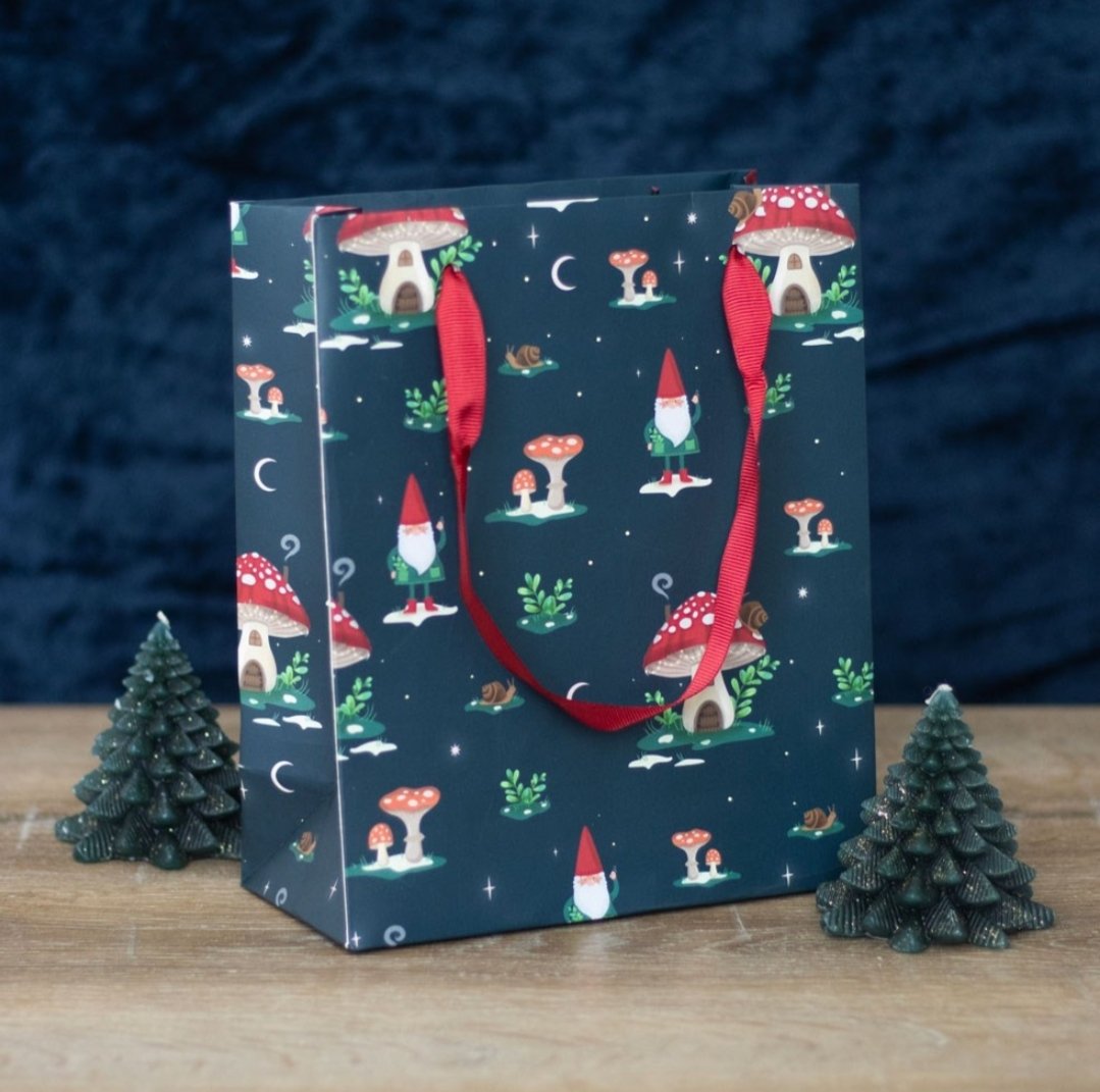 Lumoavalla talvimetsästä inspiroituneella kuviolla koristeltu lahjakassi. Lisää ripauksen juhlavaa taikaa mihin tahansa lahjaan. Kuvioina sienitaloja, etanoita ja kärpässieniä . 23 cm korkea.