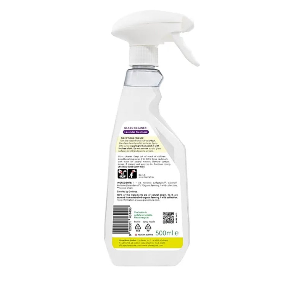 Lasinpuhdistusaine lasin, peilien, kromin ja muiden kovien ja kiillotettujen pintojen raidattomaan puhdistukseen. Laventelin rauhoittava tuoksu luo miellyttävän sisäilman, tuoksu tulee puhtaista eteerisistä öljyistä.