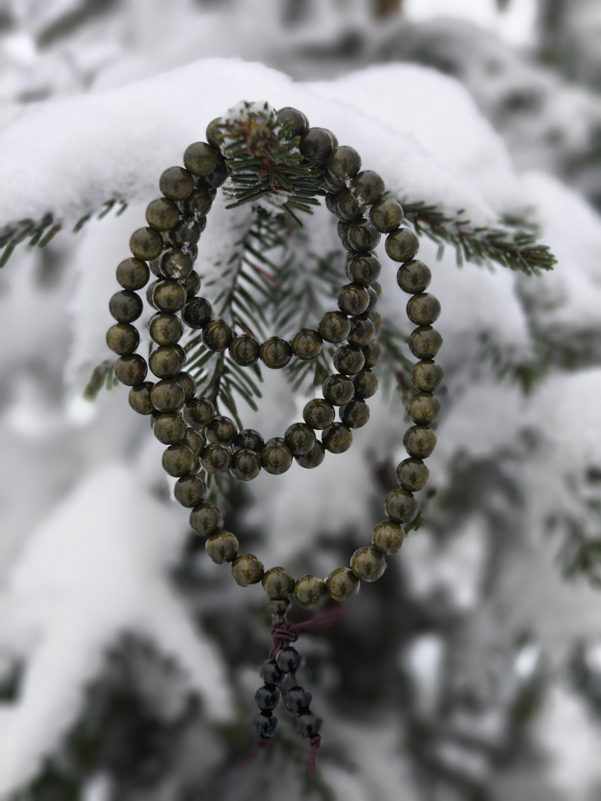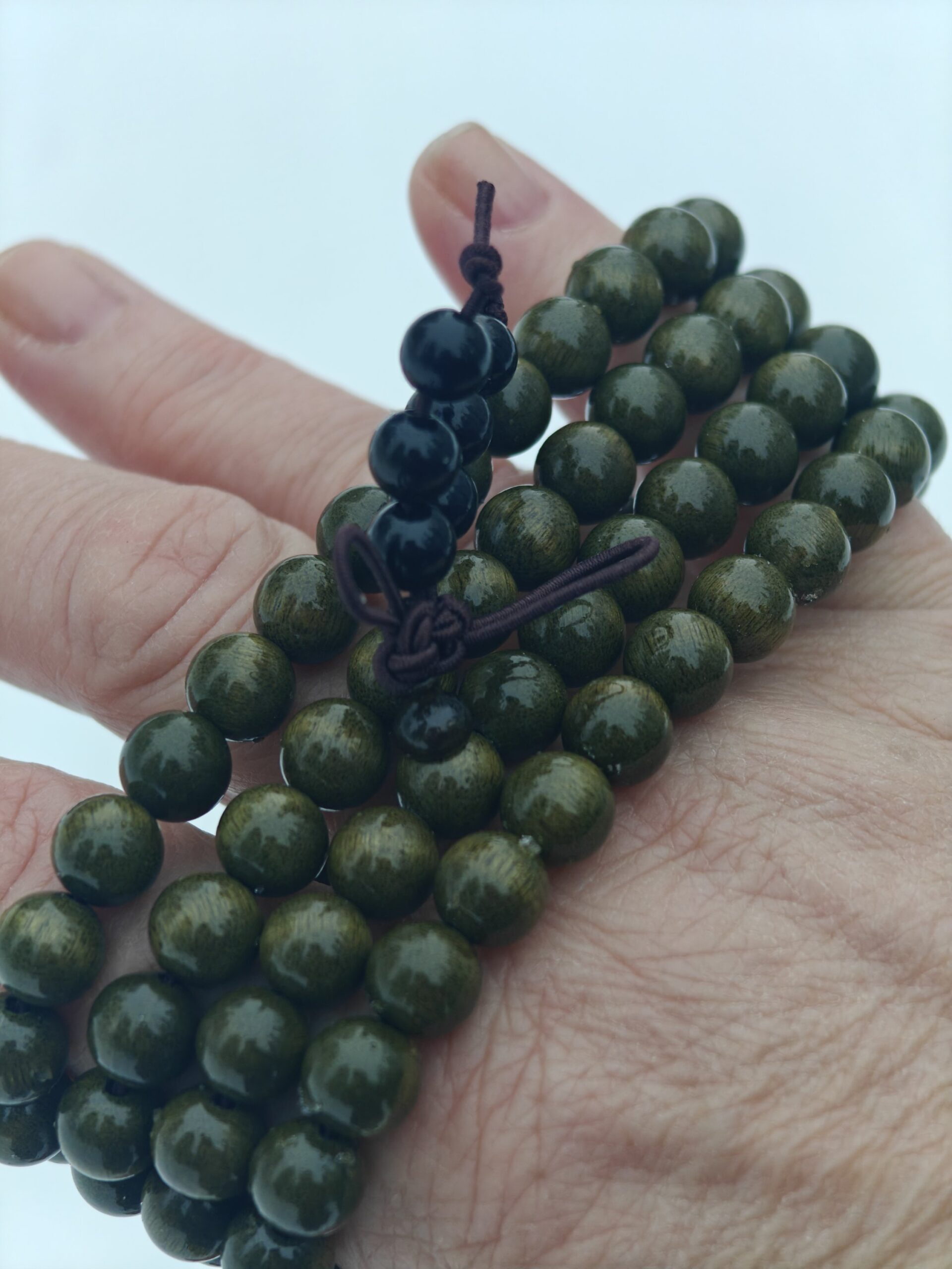 Rukous/Malahelmet vihreästä santelipuusta 108 helmeä. Helmi 8mm. Joustavat, menee neljä kertaa kierrettyä ranteen ympärille.