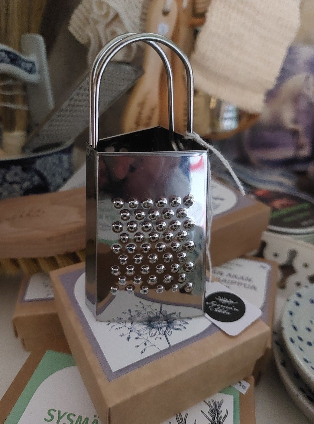 Metallinen pieni raastin siivoussaippualle. Raasta saippuasta pieniä hiutaleita raastimen pienimmällä terällä. Raastetta voit käyttää astioiden- ja pyykinpesuun sekä sekoittaa siitä yleispuhdistusaineen. Korkeus 12cm. Materiaali ruostumatonta terästä.