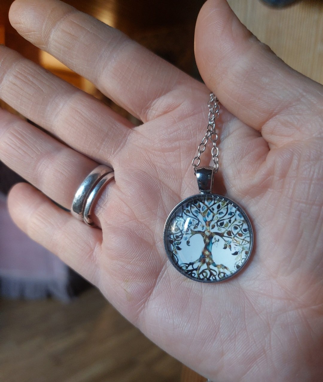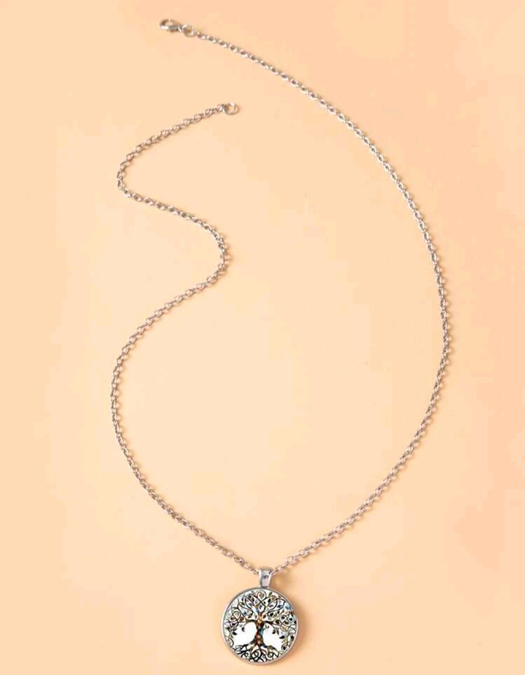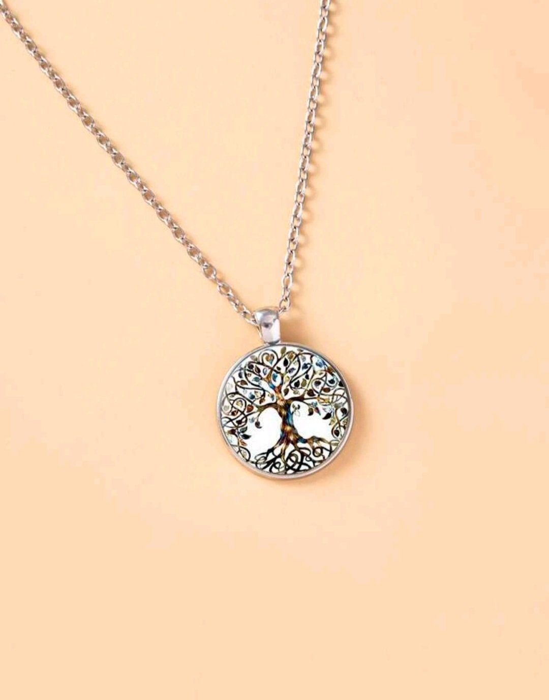 Kaunis elämänpuu kaulakoru metalliketjulla. Elämänpuu sitoo yhteen maan ja taivaan. Se kuvaa maailmankaikkeutta ja elämän kehitystä. Ketju 60cm. Medaljongin halkaisija 28mm.