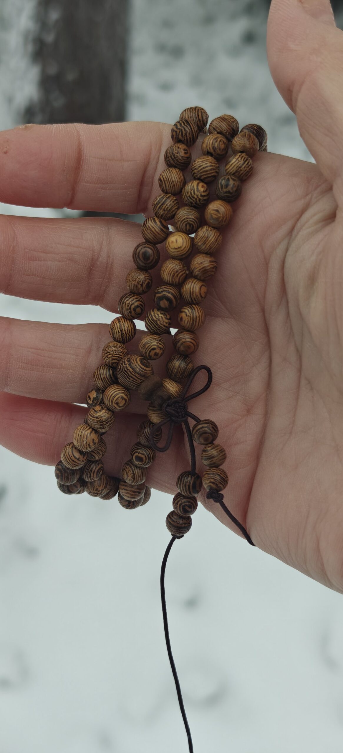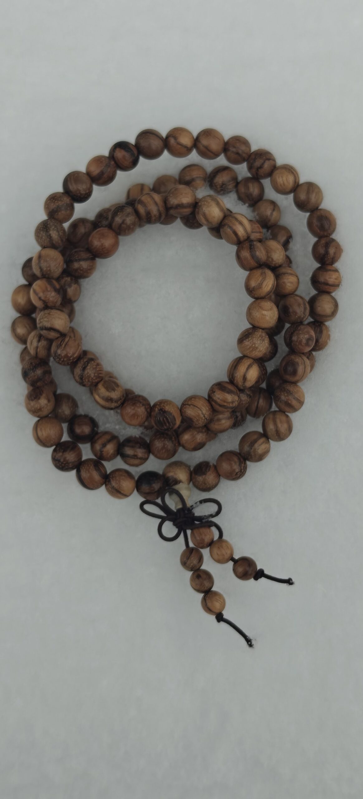 Tässä MALA-helminauhassa on 108 puuhelmeä ja se on joustava, joten sitä voidaan käyttää myös ranteessa.