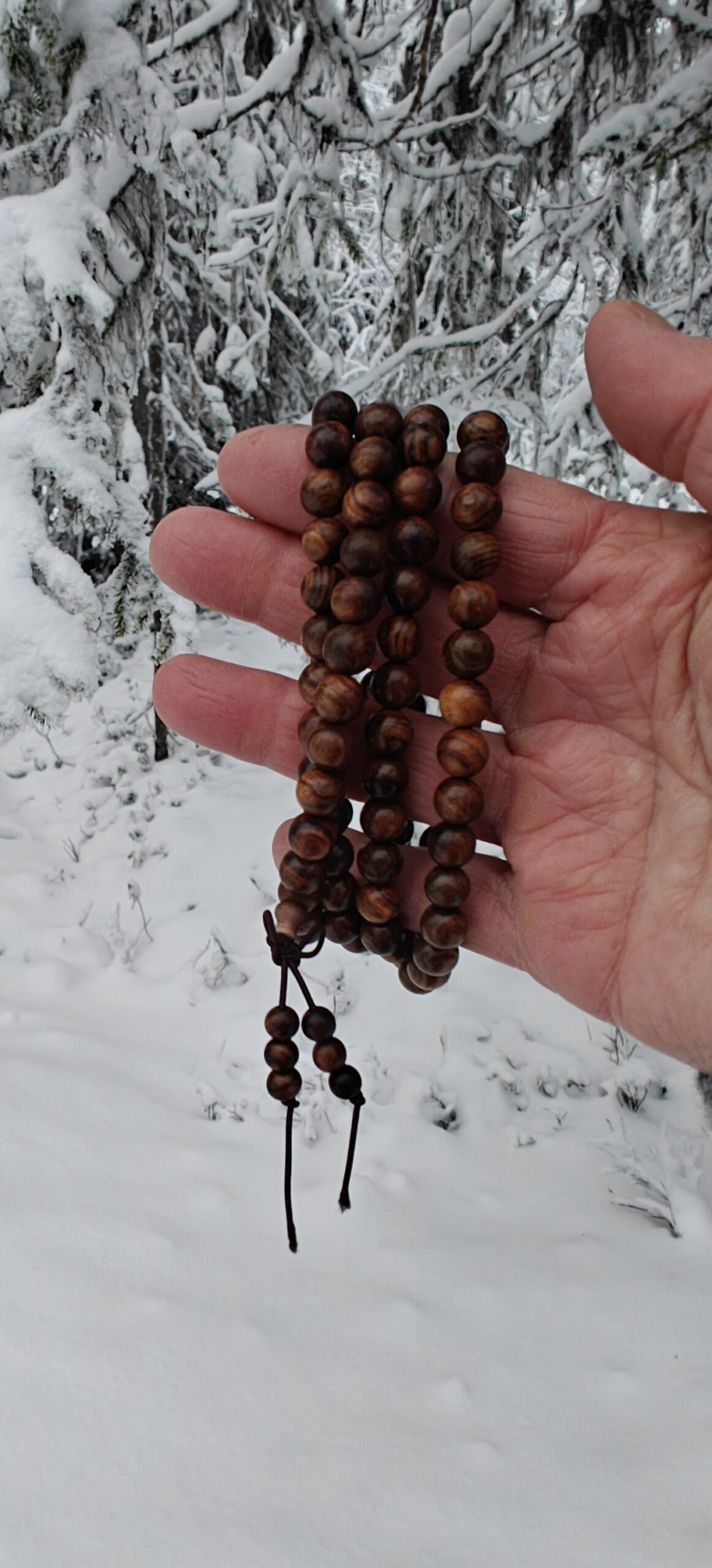 Rukous/Malahelmet tummasta ruusupuusta 108 helmeä. Helmi 8mm. Joustavat, menee neljä kertaa kierrettyä ranteen ympärille.