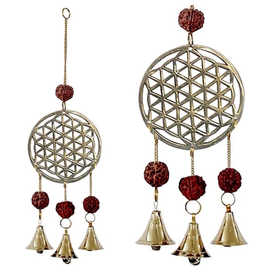 Tuulikello, jossa on rudraksha-siemeniä, kolme pientä kelloa ja elämänkukan symboli. Kelloilla on kirkas ääni.